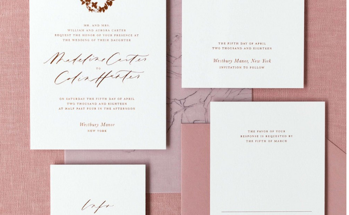 An elegant typeface design with ample white space creates a traditional design with a modern twist. This suite is perfect for adding details like vellum wraps and silk ribbon, creating a beautiful package for your guests to recieve.
